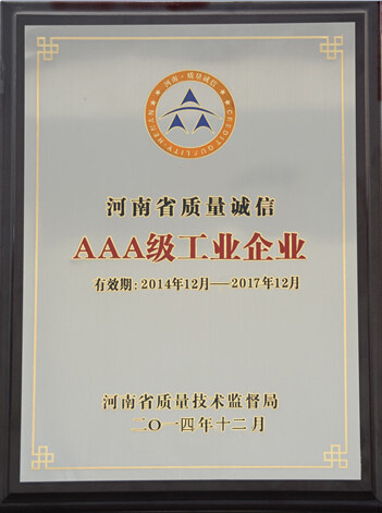 顺利获取“河南省质量诚信AAA级企业”殊荣,这标志着我公司在推进质量诚信建设得到社会各界的认可。